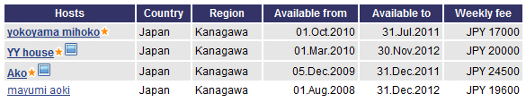 It’s pretty self-explanatory. Note that these first three include photos, which is often not the case. When I emailed people I asked them for photos of themselves and their home and offered photos of myself as well. Take special note that these prices are weekly prices in yen, and you’re expected to pay as such!