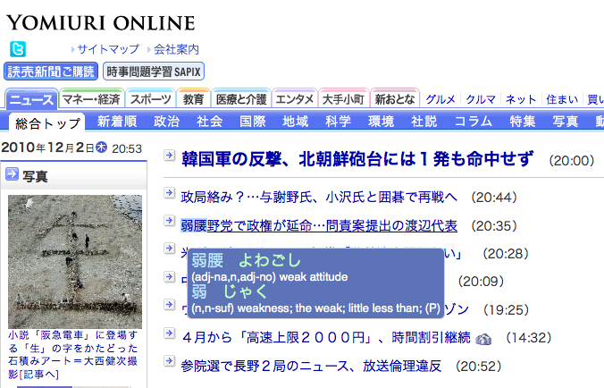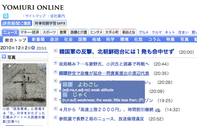 Cons: Only available for Firefox and Thunderbird, not Safari or other browsers. [Edit: A reader let us know that this add-on is now available for Google Chrome too. Thanks to KW for the update!] Sometimes the pop-up is in a weird place, and you can move the location with the A key, but on occasion, you can’t see it. This may also make you lazy if you’re prepping for the JLPT, where you need to learn to gloss over words or guess at them to finish in time, or for the JET CIR interviews, where you need to learn to read aloud without looking things up (and practice admitting you can’t read a kanji!). Be sure to download both the program AND the dictionary files.
