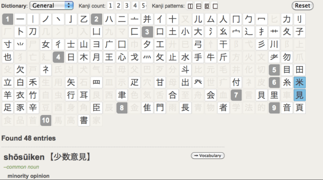 Pros: The multi-radical kanji function is more user-friendly than Jim Breen’s. That is, when you click on a radical, it visually eliminates other radicals that do not appear in any kanji with selected radical(s), which makes hunting for the next radical of the kanji much easier.