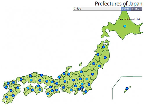 The first, from http://www.purposegames.com/ is Prefectures of Japan. Each prefecture has a little blue dot, and text appears at random telling you which one to locate on the map. You get a timer as well as a percentage correct, so it’s fun to keep track of your best time and score each play.