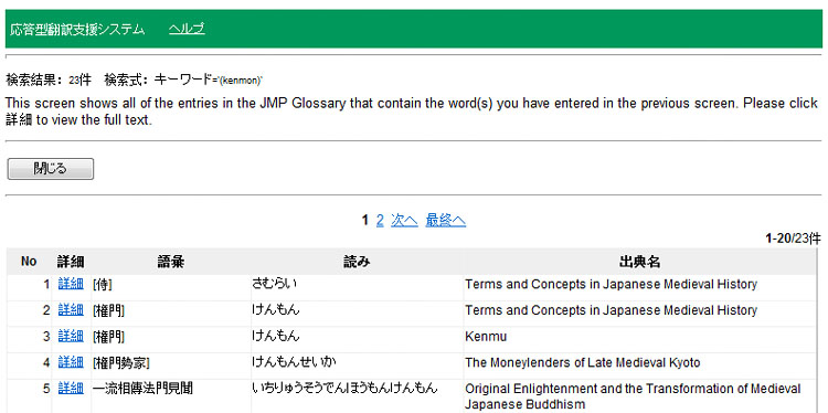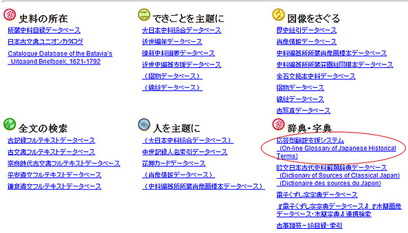 • On the far right in both Japanese and English you’ll find the link to the glossary. Click “応答型翻訳支援システム  (On-line Glossary of Japanese Historical Terms)”.
