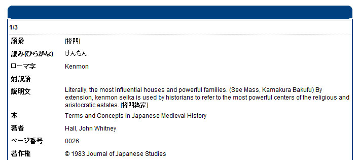 There are directions below the Japanese search buttons to explain them. You can enter things in kanji, hiragana, OR romanized text. So say I come across the word “kenmon” (権門) in my history textbook, but it’s not translated (which happens quite a bit in your average text!).