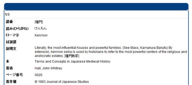 Both are useful and get you what you want, though obviously you’ll get slightly different searches since the vocab option is more specific. But as you can see in this entry, you’ll find the word, the kanji, the definition as an author has rendered it, similar or related vocabulary, and even all of the citation information (page number, publication year) and everything! How amazingly useful is that? What’s also great is that you’ll find definitions from foreign language materials too. For example, working on craftspeople research, I’ve had a lot of overlap with German publications which are the only source for some glossary terms (I then copy paste into Google translate and make my best guesstimate… ;))