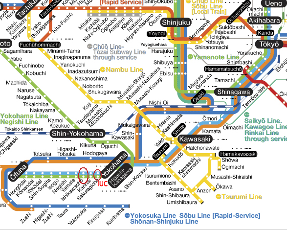 The nearest station is Ishikawacho (石川町) on the Keihin-Tohoku Line (京浜東北線). The KTL is the only line that goes through the station. To get the Yokohama subway line, you need to go to Kannai Station (10 min away), to get to the terminus of the Minato-Mirai/Tokyu-Toyoko line, you need to go to Motomachi Station (20 min away), to get the Yokohama rail line, you need to go to Sakuragi-cho (20 min walk, 4 min train) and to get to Yokohama Station with its bountiful line transfers you need to take the KTL for about 7 minutes.