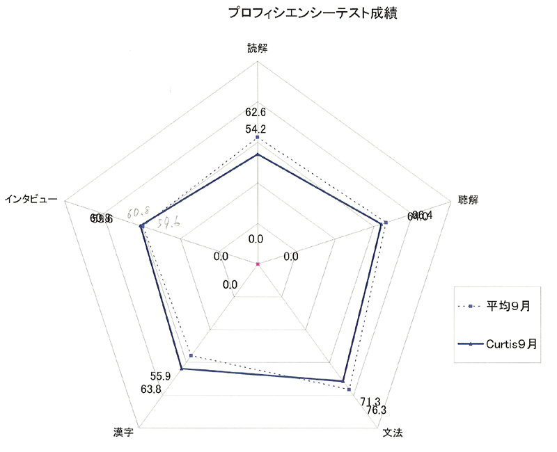 The exam itself is five parts and takes roughly three hours (with breaks) to complete. You are tested on grammar, listening comprehension, reading comprehension, kanji, and have an oral interview separately. There is also a one page take-home essay to evaluate your writing skills. The IUC then maps your results (you are not expected to get 100%!) on a 5 point spider web chart (seen on the right) that gives your own score along with the class average. My results were just below the class average, which placed me (as in the summer program) in the mid-level classes. When you finish the 10-month program you also take a substantially shorter exit proficiency exam that covers only listening comprehension, reading comprehension, kanji, and an interview.