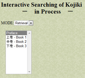 The JHTI offers two modes to access content: “Retrieval” and “Browse”. For “Retrieval”, select either Japanese or English, and then type in the character or string of characters, or the word or string of words, you wish to find and study. For “Browse”, the user simply explores the content from the selected text in its entirety in both Japanese and English. (Because there is only an English version available to the Preface of the Kojiki, the user is unable to search or browse the Japanese original.)
