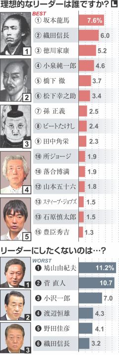 This week’s Fun Link Friday comes from Japan Probe’s posting of an online poll from Sankei Shinbum in a leadership series on January 2nd. The poll asks participants to rate who they thought were ideal leaders and the worst leaders, past and present.
