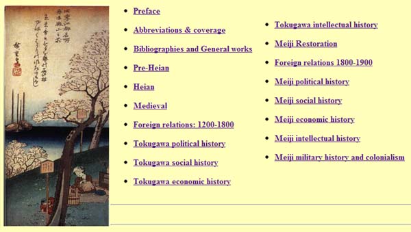 Particularly extensive topics such as foreign relations get their own sections divided into 1200-1800 and 1800-1900, which include subdirectories for contacts with Asia, Europe, and the Christian Century in the former and more country-specific contact in the latter. Broad bibliographies and general works and the names and websites (when applicable) for many journals are also recorded.
