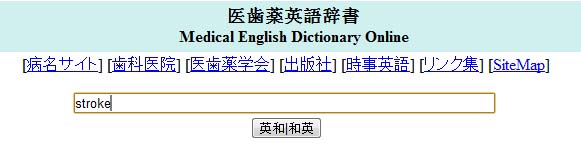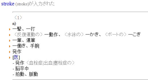 The site offers a very easy catch-all search function at the top (see above), where you can input either English or Japanese terms for a generic search. I, for example, put in the term “stroke,” as I’ve had to actually come up with and use this term in Japan before. Click the 英和|和英 button to search for your English or Japanese equivalent. On the results page, scroll down past the dictionary advertisements and you’ll find several sections of information (though not every search will yield this much).