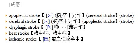 The first entries provide a number of words, but as you can see, not all are medical and many fulfill other definitions of “stroke,” such as 運筆, referring to brush strokes. Take note of the words marked with [医] (for 医学, or medical science), which provide a number of technical medical vocabulary options for your purposes.