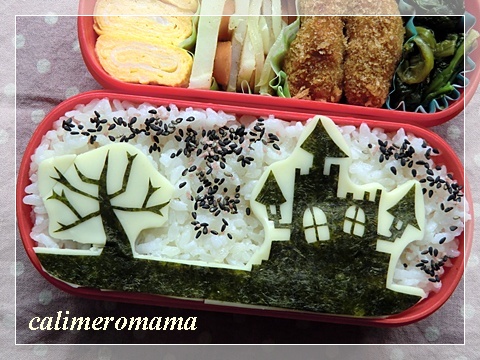 Calimeromama’s haunted house bento features a silhouette made of rice, nori, cheese, and ume-goma-shio (plum sesame salt):