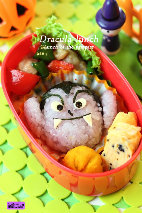 マイティのブログ features several Halloween bentos, including this vampire-themed one: