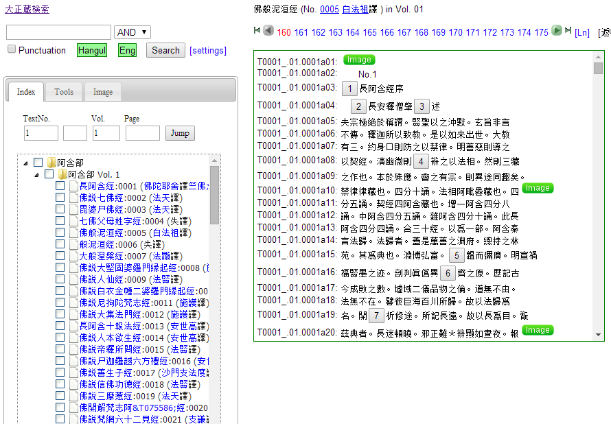 The main search/browsing area neatly organizes the texts by title and volume, and allows the user to jump to a desired section by text, volume, or page number, with the text of the page appearing in the middle section of the webpage. There are useful options to alter your reading experience of the main text as presented, such as viewing it with or without kaeriten.