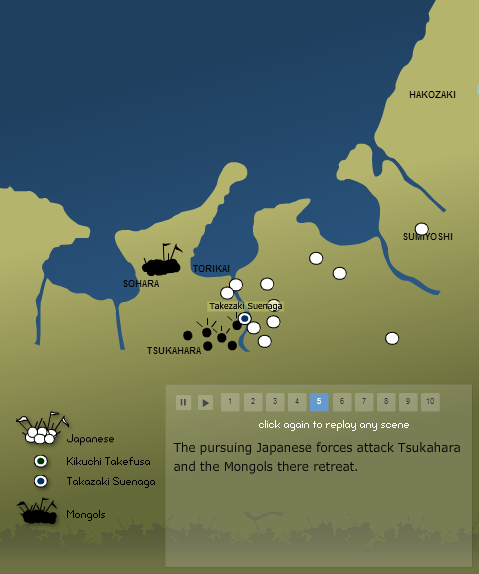 The second main section of the site provides interactive maps of the invasions. Here you can see the movements of both Japanese and Mongol forces over the course of the campaigns in 1274 and 1281, including destruction wrought by the Mongols and the construction of defensive stone barriers by the Japanese. Broken down into ten sections per map, the progression is briefly described as it plays out. You can click through to your desired point in the battles or press the play button to watch it visually play out.