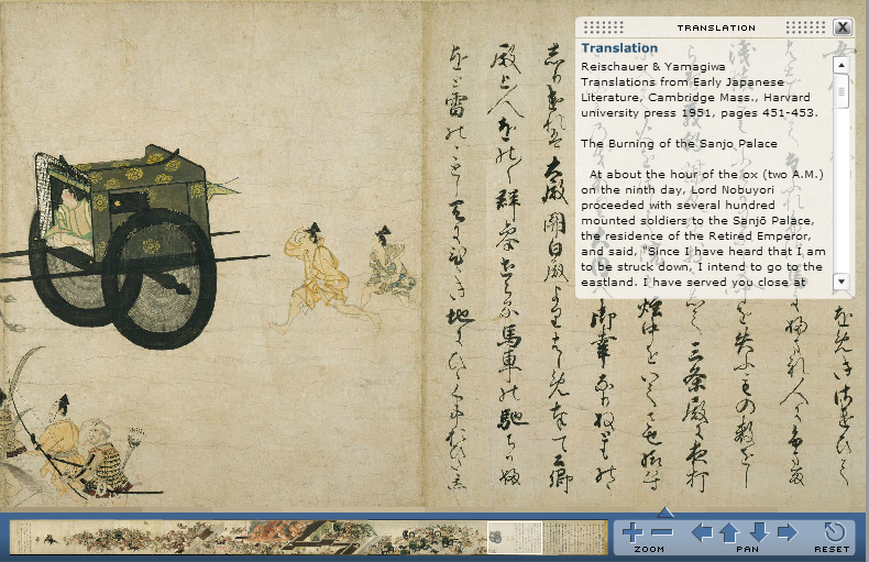 The Reading the Scroll window provides narrative details about how the scroll visually unfolds the story of the Heiji Disturbance. Although this area of the scroll viewing is a bit sparse in explanation, to the right there is also a button for “Translation” that offers another mobile pop-up window with a translation of the opening portion of the scroll.