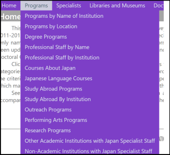 Partially updated in 2015, this directory contains an excellent (although not comprehensive) database of programs, specialists, libraries and museums, and doctoral candidates/recent PhDs in various areas of Japanese Studies. At the time of the survey, 1,693 specialists, 287 programs, and 88 libraries responded, making this list an impressive place to start exploring your interest in academic institutions.