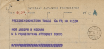 primarily of correspondence written during Keenan’s work as Chief Counsel in the International Prosecution Section. Most of the correspondence relates directly to the trial. There is a small subsection of letters between Keenan and colleagues from his Washington, D.C. law firm. Additional documents in the collection include: material relating to the court-martial of Major Walter V. Radovich; a three-page transcript of a 1946 interview with Madame Chiang-Kai-Shek; letters from Japanese and American citizens expressing their opinions on the war crime trials and the war itself; as well as some candid notes by Keenan on Japan and his work. The collection also includes newspaper clippings, photographs, business cards and notes.